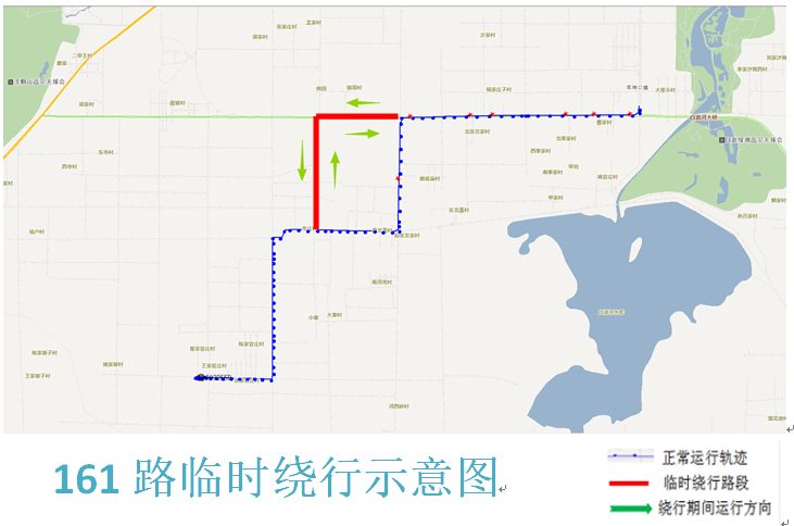 161路上行方向:车辆从王家官庄村(潍大食品)发车,沿原线运行至辛庄村后,沿利民路至潍水西街东行恢复原线运行,不再运行柳白路(辛庄村-官河路)、官河路(柳白路-潍水西街)路段(下行方向反之亦然)。